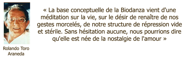 Intensément concerné par le devenir humain, touché par les guerres et les atrocités dont le siècle était témoin, Rolando Toro a senti combien la domination de la rationalité et du langage avait inhibé en l'être humain la capacité à être dans le présent émotionnel, sensible et affectif de la vie. Et combien, ainsi, il se coupait de son essence, et de la vie. C'est lors de ses recherches sur des méthodes alternatives de traitement en milieu psychiatrique et grâce à ses observations sur les effets de la musique et du mouvement sur la santé, qu'il a eu l'intuition du système Biodanza.